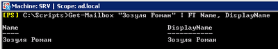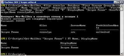 New-Mailbox -Alias rzozulya -Database “First Storage Group\Mailbox Database" -Name "Зозуля Роман” -OrganizationalUnit “ad.local/Users” -FirstName "Роман" -LastName "Зозуля" -Initial "В" -DisplayName “Зозуля Роман” -UserPrincipalName rzozulya@ad.local