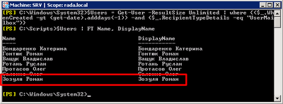 Нижче наведено приклад, в якому користувачів вже створено в форматі <FN> <I>. <LN> засобами Exchange 2007 – EMC.Вам не потрібно хвилюватись стосовно зміни кожного імені вручну, адже в пригоді стане PowerShell. Нижче наведено скрипт, котрий змінює імена та відображувані імена всіх користувачів поштових скриньок в формат <LN> <FN>.